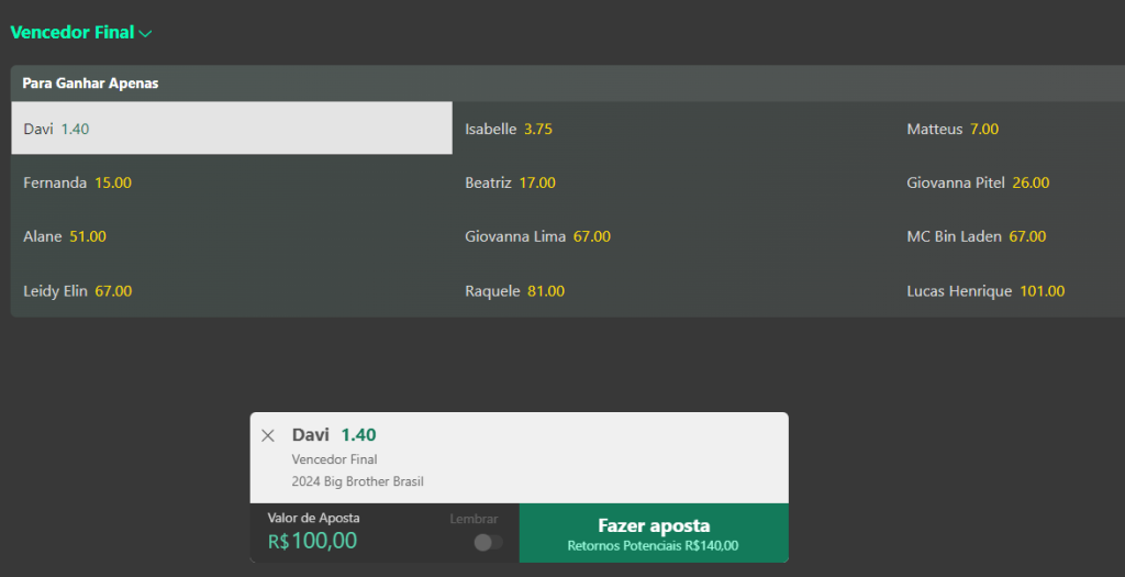 Uma dica para encontrar as apostas no BBB 2024 é na casa de apostas Bet365. Na barra de pesquisa procure por “Big Brother Brasil”, ou então pelo menu nas opções “especiais”.